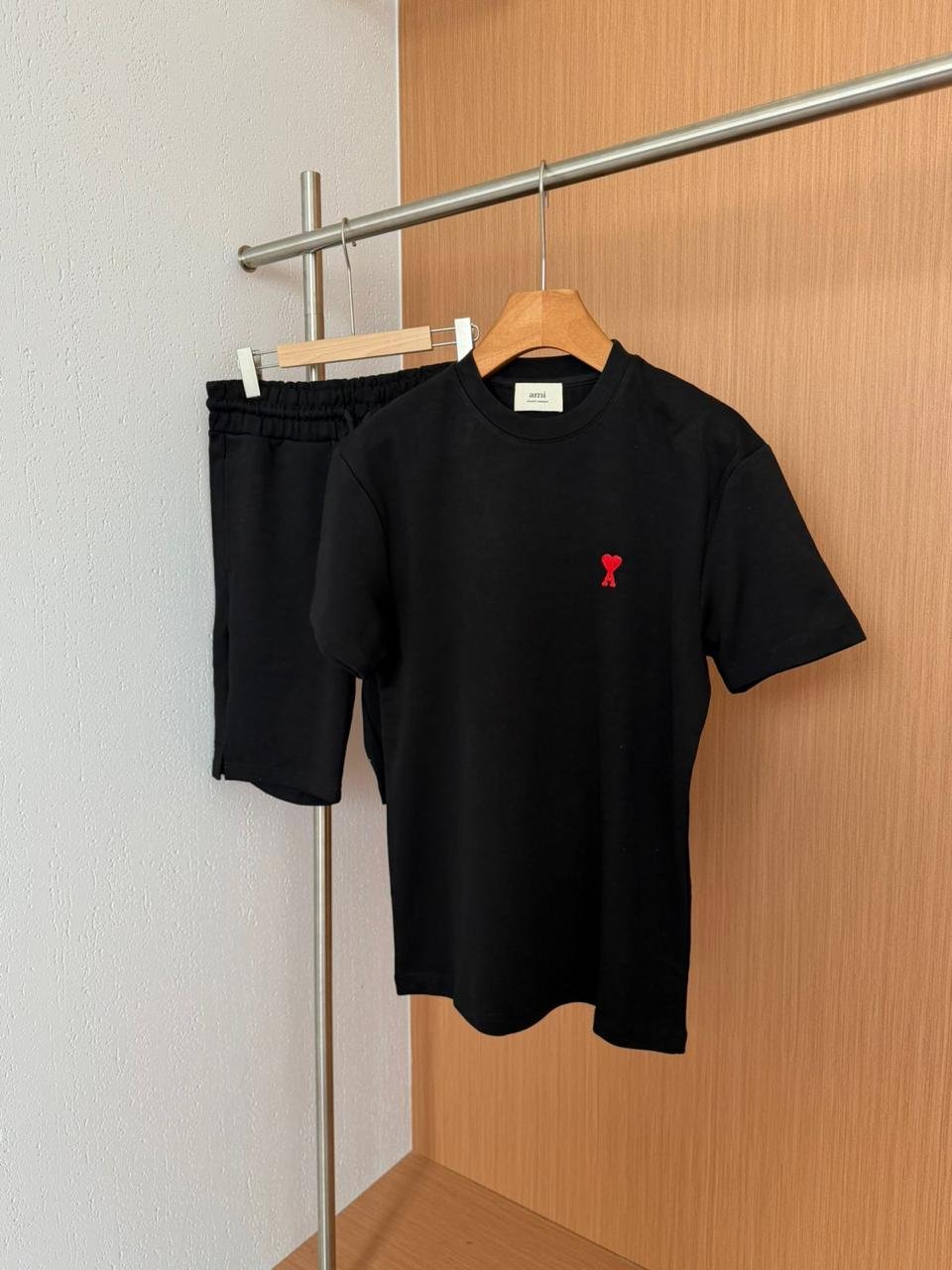 The ultimate elevated basic. This AMI Paris set includes a structured crewneck t-shirt and matching drawstring shorts, both featuring the signature “Ami de Coeur” red heart logo. Made from high-quality jersey cotton, the set offers a clean, minimalist silhouette suitable for sophisticated lounging or stylish weekend outings.