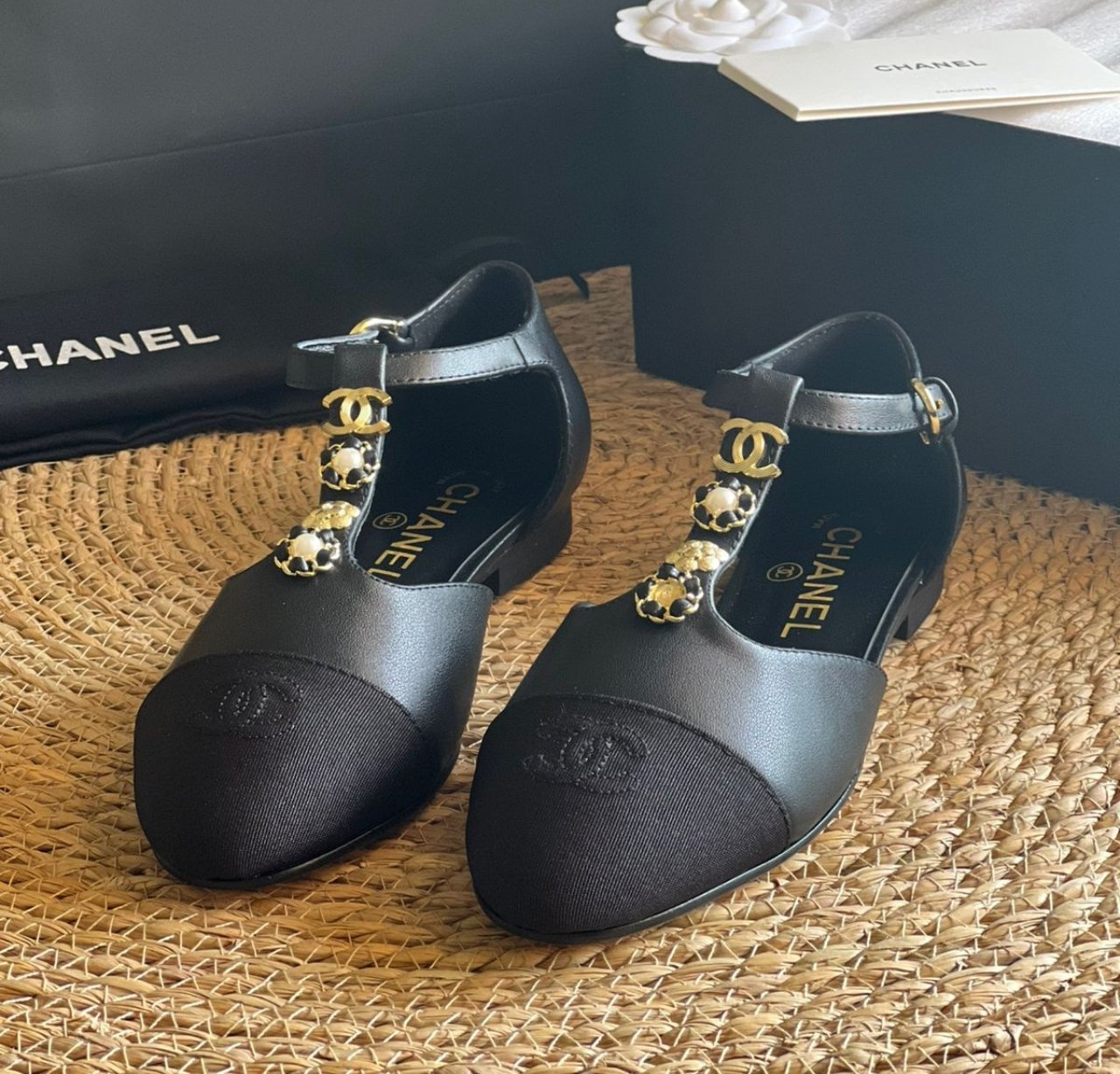 The Chanel Mary Jane Flats in black offer a sophisticated take on a timeless silhouette. Crafted from premium materials with a sleek patent or smooth leather finish, these flats feature the iconic Mary Jane strap and subtle Chanel branding. Their classic design and comfortable fit make them a chic choice for everyday wear or elegant occasions.
