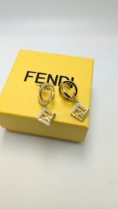These Fendi earrings combine the classic appeal of a polished gold hoop with the iconic Baguette branding. Suspended from sleek interlocking rings is a geometric FF logo charm, bordered by shimmering crystals. They offer a perfect movement and a high-shine finish that frames the face beautifully.