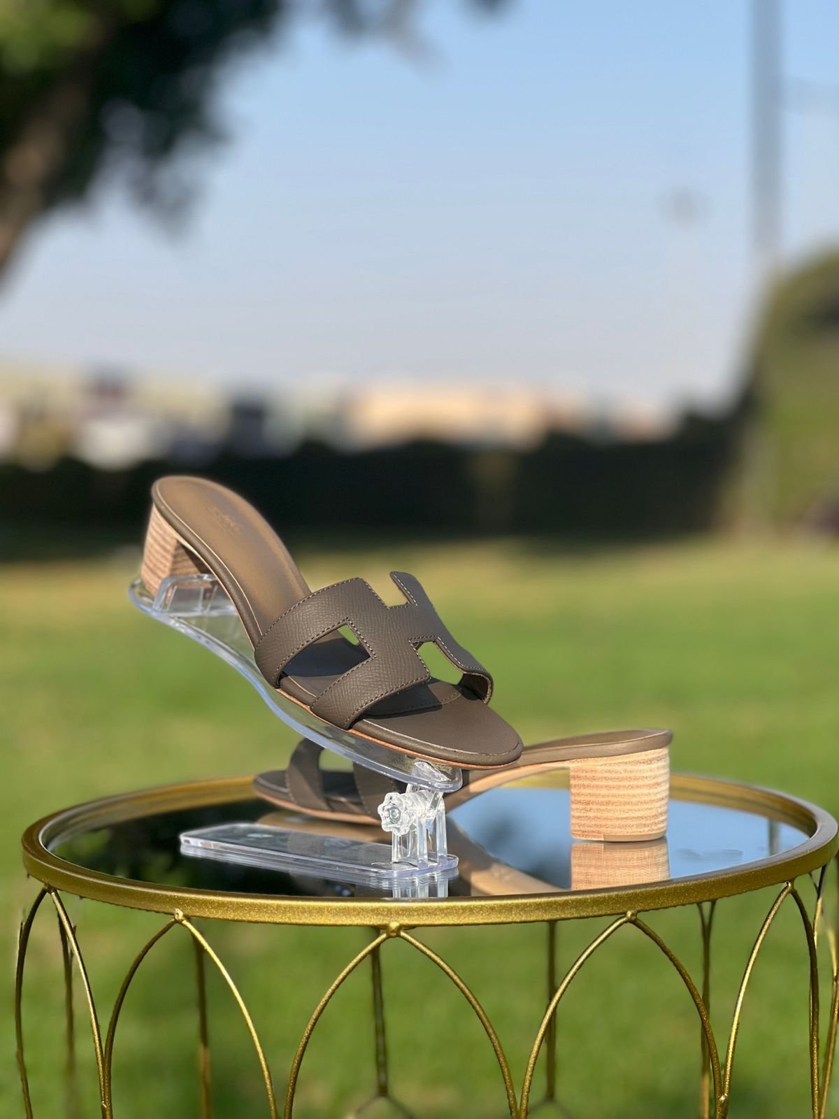 The Hermès Oasis Sandals in Etoupe are where iconic design meets subtle sophistication. Featuring the signature “H” cut-out strap crafted from premium calfskin leather, these sandals are a modern upgrade to the classic Oran — now with a low block heel for added elegance and versatility.