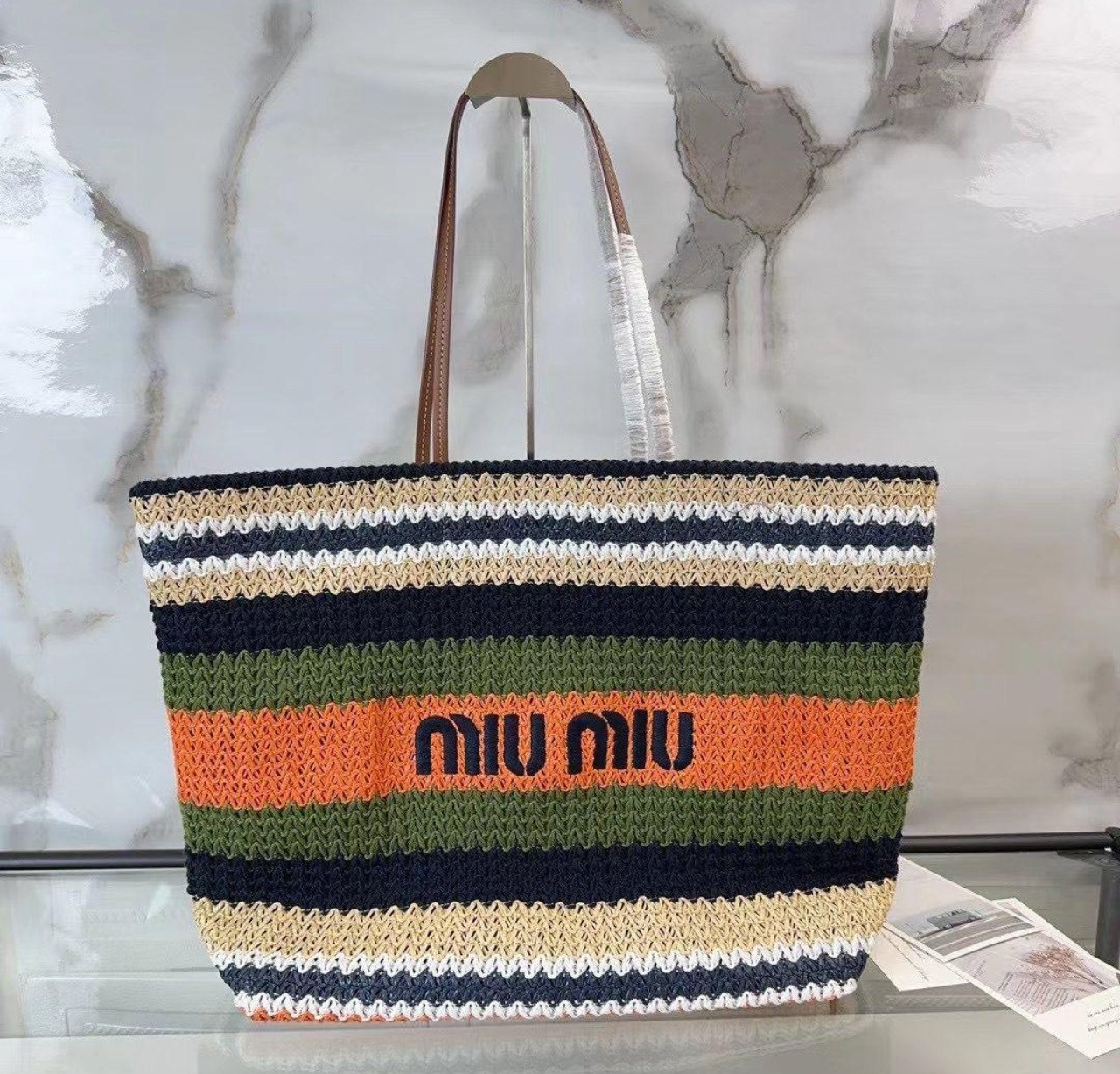 The Miu Miu Multi-Colored Canvas Tote Bag is a vibrant, utilitarian-chic essential that turns everyday errands into a style statement. Featuring bold vertical stripes in navy, orange, olive green, and beige, this tote blends functionality with fearless fashion.