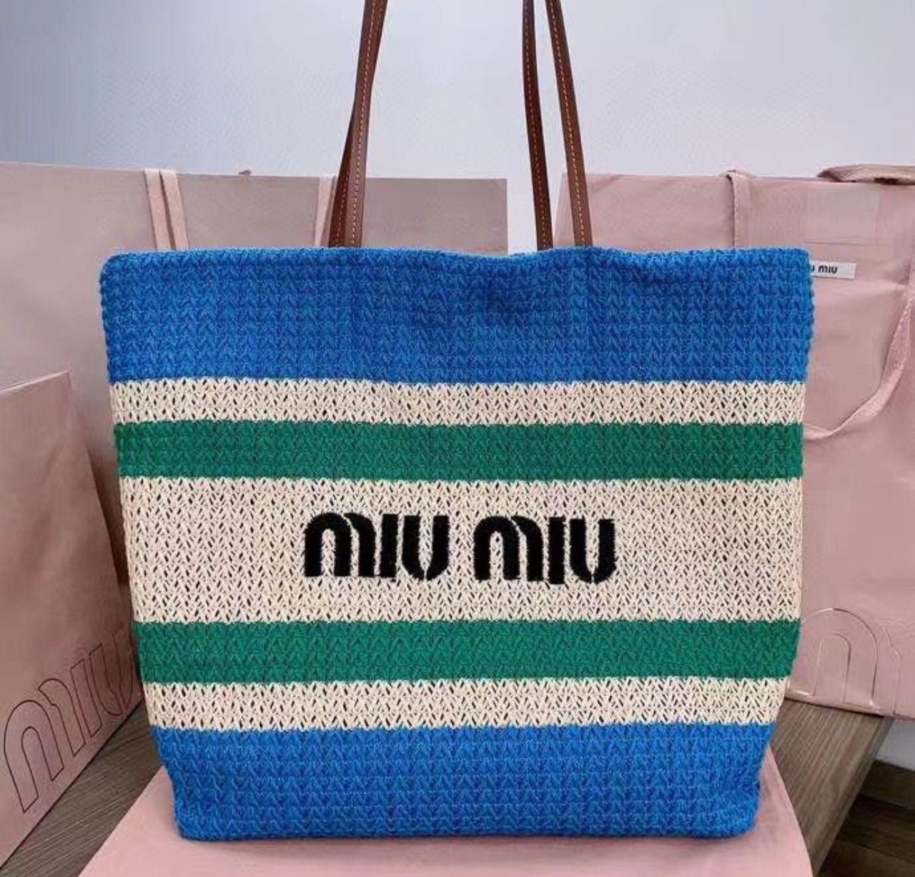 Miu Miu Raffia Tote Bag – Beige / Light Blue